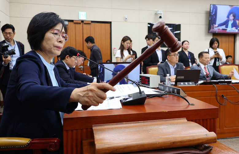 14일 오전 국회에서 열린 과학기술정보방송통신위원회의 '불법적 방송문화진흥회 이사 선임 등 방송장악 관련' 1차 청문회에서 더불어민주당 소속 최민희 위원장이 의사봉을 두드리고 있다. 2024.8.14