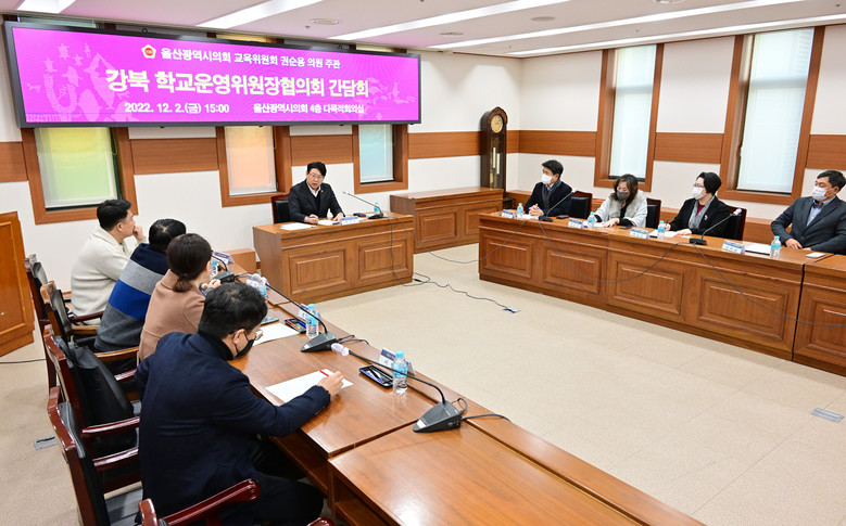 [울산 세계타임즈=이호근 기자] 울산광역시의회 권순용 의원(교육위원회)은 2일 오후 3시, 강북 학교운영위원장협의회 임원 8명과 함께 간담회를 개최하고, 학교 급식단가 인상, 조리사 파업 시 대체식 지급 및 학교운영위원장협의원 지원 등에 대해 의견을 청취했다.