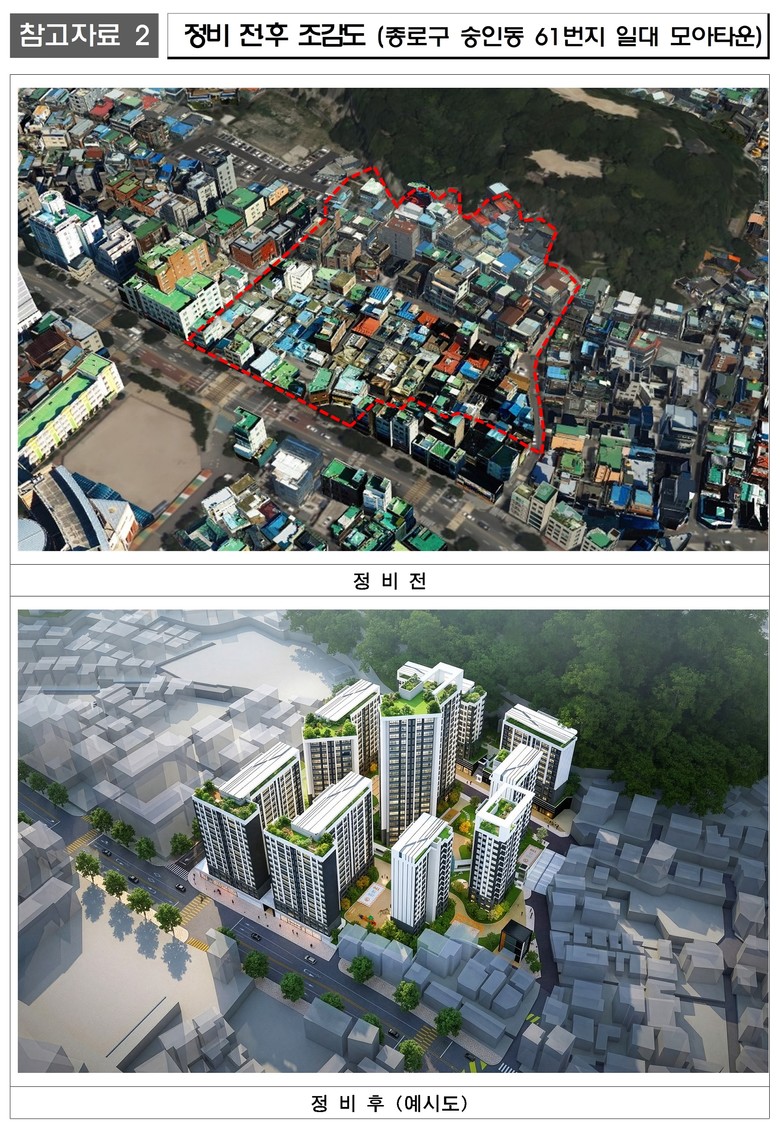 종로구 숭인동 61번지 일대(17,413.3㎡)는 모아타운 사업으로 기존 239세대에서 179세대 늘어난 총 418세대(임대 88세대 포함)를 공급할 예정이다.