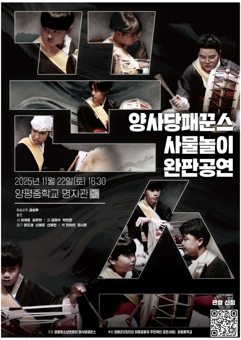 [세계타임즈=양평군 송민수 기자] 양평군(군수 전진선)은 교육협력센터 공모사업인 ‘양평형 마을공동 교육과정’의 사물놀이 프로그램을 운영 중인 양평중학교 사물놀이 동아리 ‘양사당패 꾼스’가 오는 22일 오후 4시 30분, 양평중학교 명지관에서 기념 공연을 개최한다고 밝혔다.