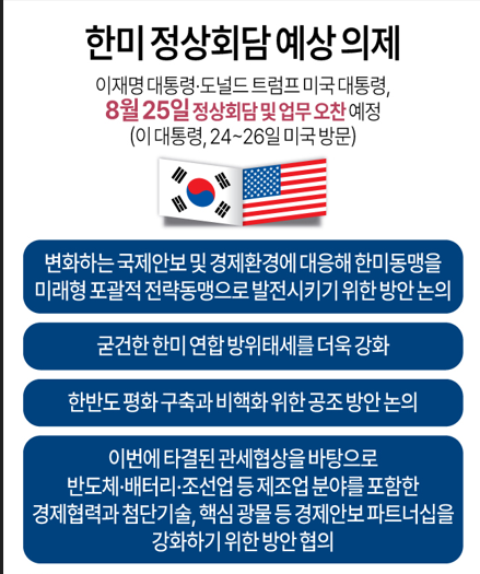 강 대변인은 "두 정상은 변화하는 국제안보 및 경제환경에 대응해 한미동맹을 미래형 포괄적 전략동맹으로 발전시키기 위한 방안을 논의할 예정"이라며 "굳건한 한미 연합 방위태세를 더욱 강화하는 가운데 한반도의 평화 구축과 비핵화를 위한 공조 방안에 대해서도 논의하게 될 것"이라고 설명했다. "이번에 타결된 관세협상을 바탕으로 반도체·배터리·조선업 등 제조업 분야를 포함한 경제협력과 첨단기술, 핵심 광물 등 경제안보 파트너십을 강화하기 위한 방안도 협의할 것"이라고 덧붙였다.