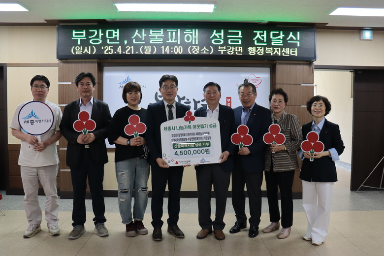 [세종 세계타임즈=이채봉 기자] 세종특별자치시 부강면(면장 최의헌)이 21일 부강면 행정복지센터에서 최근 영남권 산불 피해 지역 주민들을 돕기 위해 지역단체와 함께 450만 원의 성금을 기탁했다.