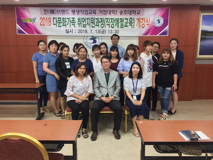 [횡성군=세계타임즈 김민석 기자] 송호대학교(정창덕 총장)와 횡성군건강가정·다문화가족지원센터(박재홍 센터장)는 산학협력을 통해 횡성지역내 다문화가족의 적극적인 사회활동과 취업 등을 지원코자 ‘다문화가족 직장예절 평생직업교육’ 개강식을 2018년 7월 13일(금) 송호대학교 창조관 이미지메이킹 전용 실습실인 식음료실습실에서 거행하였다.