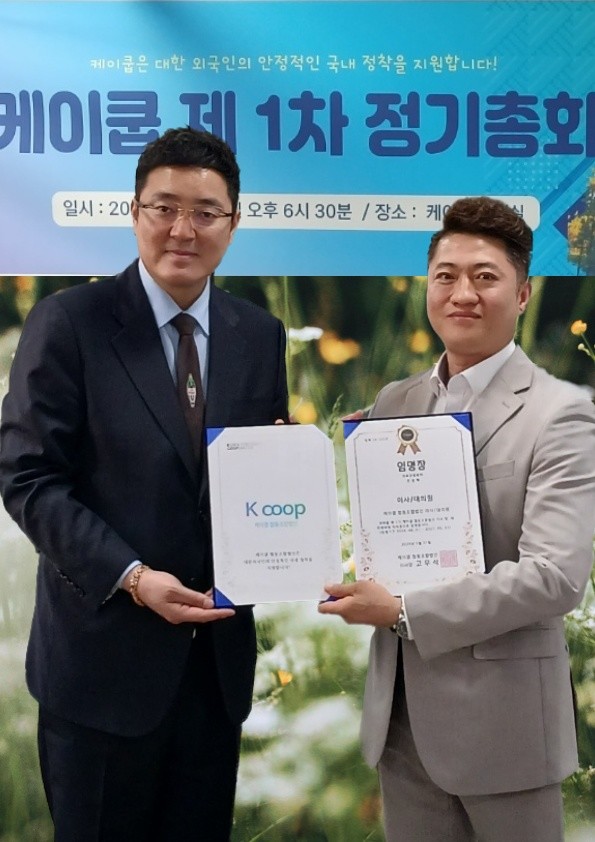 [세계타임즈]최성룡기자 = 케이쿱(대한외국인협동조합 / 이사장 고우석)은 지난 5월 31일 케이쿱 회의실에서 첫 번째 정기총회를 개최하고 임명장을 수여했다.