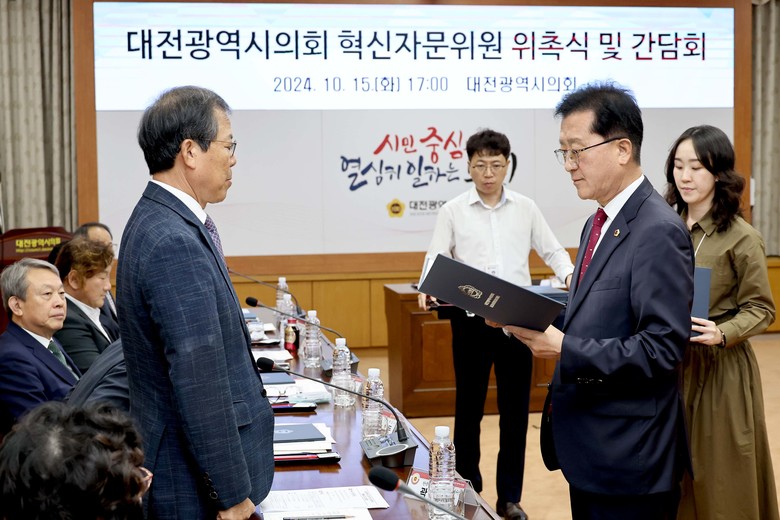 [대전 세계타임즈=이채봉 기자] 대전시의회는 15일 시의회 소통실에서 대전광역시의회 혁신자문위원 위촉식 및 간담회를 갖고, 대전시의회의 역사 이래 최초로 의장 직속 ‘대전광역시의회 혁신자문위원회’의 공식 출범을 알렸다.