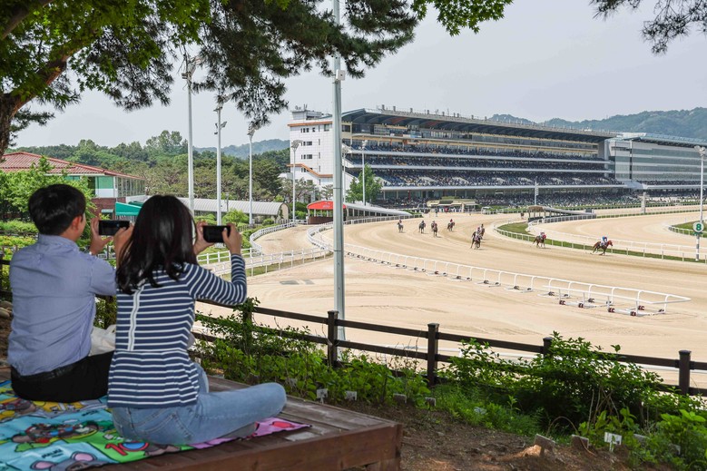 다음으로 소개할 명소는 경주로가 눈앞에서 펼쳐지는 벚꽃길 산책로 옆 잔디 구역이다. 멀리서 경주를 볼 수 있지만 베팅구역이 아니므로 입장료가 없다는 점이 메리트다. 산책할 수 있는 나무 데크와 잔디밭으로 이루어진 이곳은 방문객들이 편히 쉬어갈 수 있도록 테이블과 의자, 평상, 벤치 등이 준비되어 있다. 자리가 없다면 잔디 위에 돗자리를 깔고 앉으면 된다. 시원한 나무그늘 아래에서 가벼운 먹거리와 함께 경치를 즐길 수 있는 피크닉 명소이다 보니, 인파가 몰리는 축제나 행사 기간에는 미리미리 자리를 맡아야 한다.