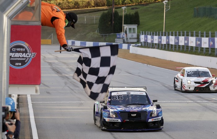 [사진설명] 서한퍼플 모터스포트의 장현진(66번)이 27일 에버랜드 스피드웨이에서 열린 2018 CJ대한통운 슈퍼레이스 챔피언십 8라운드 캐딜락 6000 클래스 결승에서 1위로 체커기를 받고 있다.