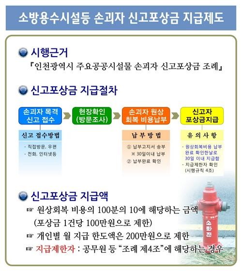 이 제도는 상습주정차지역의 접촉사고로 인한 소방용수시설물 파손, 소화전 관구캡 도난 등을 예방하고자 전국 처음으로 추진되는 것으로, 신고방법은 손괴차량 발견 시 현장사진, 차량번호 등을 확보하여 가까운 소방서에 방문, 유선으로 신고하면 신고자에게 1건당 100만원 한도 내에서 원상회복비용의 10%를 표상금으로 지급하게 된다. 포상금은 건당 100만원을 초과할 수 없으며 개인별 월 지급 한도액은 200만원으로 되어 있다.