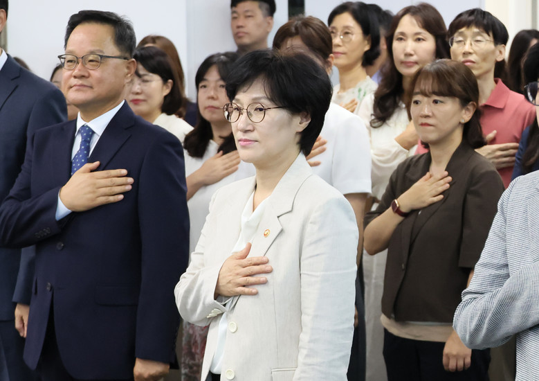 원민경 신임 여성가족부 장관이 10일 서울 종로구 정부서울청사에서 열린 취임식에서 국기에 경례하고 있다. 2025.9.10