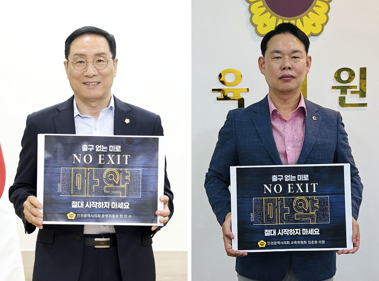 [인천 세계타임즈=심하린 기자] 인천광역시의회 교육위원회 한민수(국·남동5·의회운영위원장)·임춘원(국·남동1) 의원이 사회문제로 대두되고 있는 마약 근절을 위해 ‘NO EXIT’ 캠페인에 동참했다.