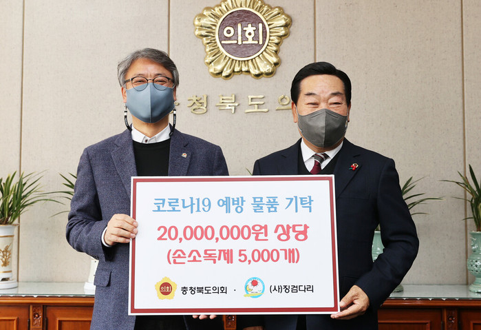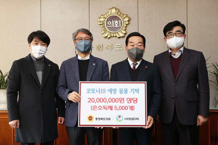 [충북=세계타임즈 이현진 기자] 충북도의회는 3일 의장 집무실에서 사단법인 징검다리(대표 임동현)에 손소독제 5,000개를 기탁했다.