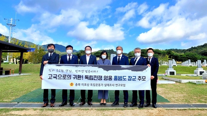 [충북=세계타임즈 이현진 기자] 충북도의회 의원 연구단체 ‘충북 미포상독립운동가 실태조사 연구모임’(대표의원 송미애) 회원들이 대전 국립현충원 홍범도 장군 묘소를 찾아 추모의 시간을 가졌다.