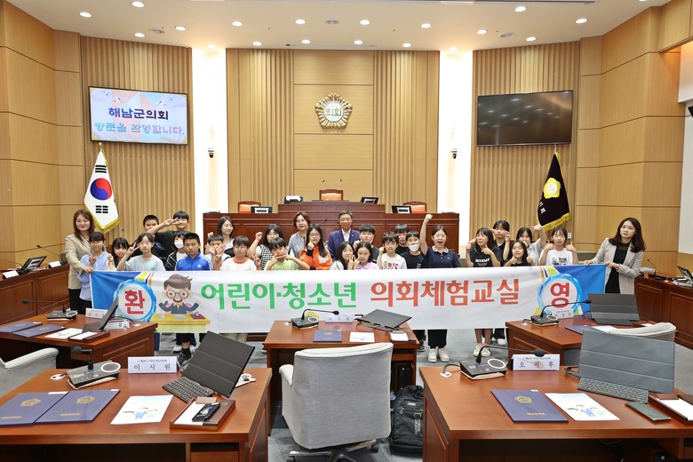 이번 제7회 해남군의회 어린이·청소년 의회체험교실은 해남서초등학교 5학년 학생 24명이 참여하여 의장, 의원, 조례안 발의자, 사무과장, 의사팀장 등 각각의 역할을 맡아 개회 선포, 집회보고, 직접 만든「해남군 골목길 안전에 관한 조례안」을 가지고 제안설명, 토론 및 표결을 해보는 등 실제 본회의와 동일하게 진행 되었다.
