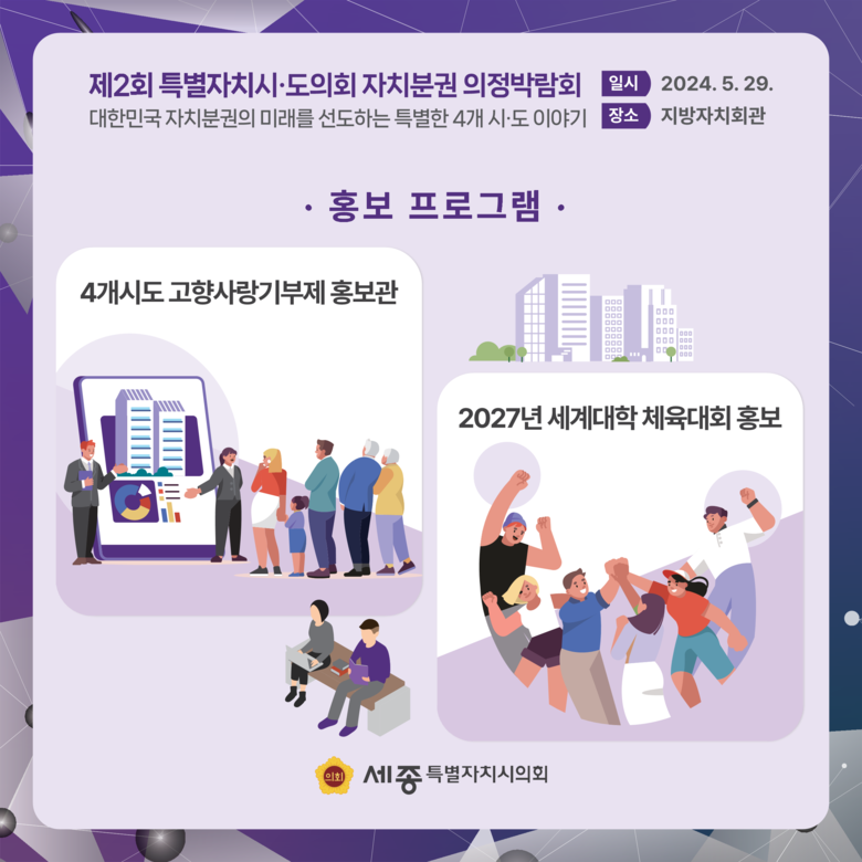 제2회 특별자치시‧도의회 자치분권 의정박람회는 세종시의회 주관으로 열리며 토론회와 토크 콘서트, 전시 및 홍보 부스, 지역별 문화 공연 등 다채로운 프로그램으로 구성돼 있다.