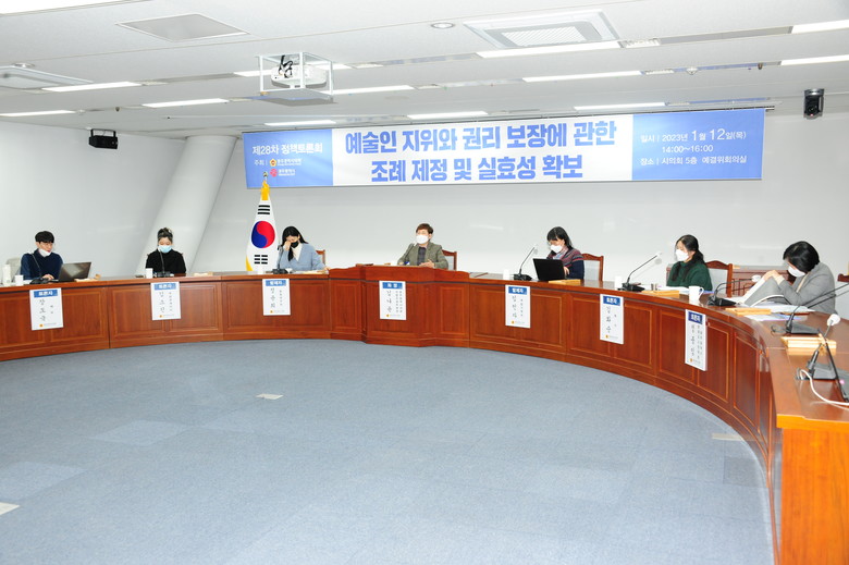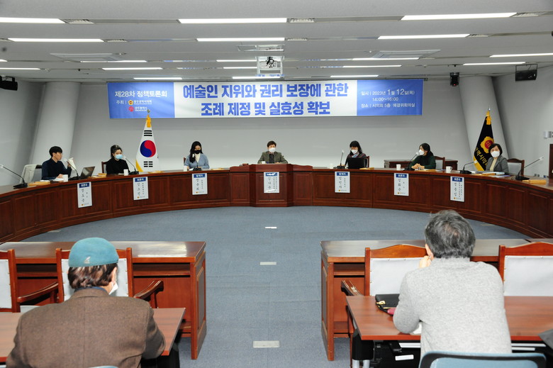 김나윤 시의원을 좌장으로 임인자 독립기획자(광주시 예술인 권리보장 TF 부위원장), 정윤희 문화연구자(前 문체부 예술인 권리보장법 입법추진 TF 위원)가 각각 발제를 맡았다. 김화순 화가(광주여성예술인연대), 김소진 독립큐레이터(시각예술단체 1995Hz 대표), 장도국 배우(광주시 예술인 권리보장 TF 위원), 정종임 광주시 문화도시정책관이 토론자로 참여했다.