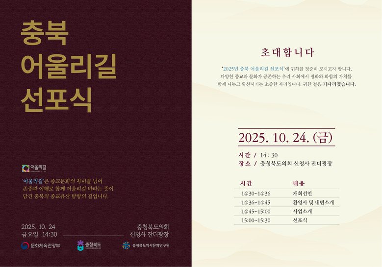 충북도는 지난 5월 문화체육관광부 공모사업인 ‘2025 종교평화 문화프로그램’에 선정된 이후, 4개 종단이 참여하는 추진협의체를 구성하여 프로그램 개발과 운영을 위해 종교계와 협력을 이어왔다.