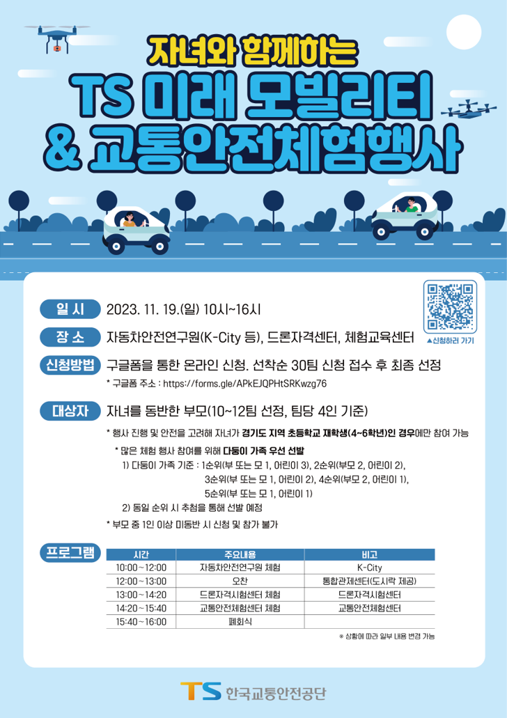 기준(다둥이)에 따라 10~12가족(약 40명)을 최종 선정할 예정이며 미래 성장동력인 모빌리티시대의 주역이 될 꿈나무들이 일상의 변화와 교통안전을 직접 체험하는 행사로,