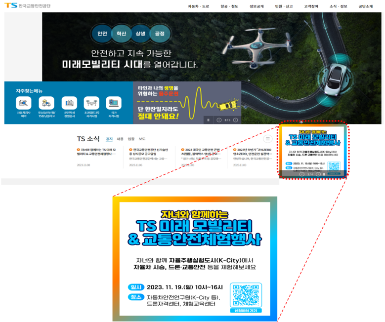 [세계타임즈 = 이영진 기자] 한국교통안전공단(이사장 권용복)은 11월 19일(일) 경기도 화성시에 위치한 자동차안전연구원, 드론자격센터, 교통안전체험교육센터에서 대국민 서비스 제공을 위한 ‘TS 미래 모빌리티&교통안전체험 행사’를 개최한다고 밝혔다.