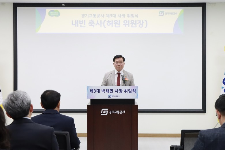 [경기도 세계타임즈=송민수 기자] 경기도의회 건설교통위원회 허원 위원장(국민의힘, 이천2)은 27일 경기교통공사에서 열린 제3대 박재만 사장 취임식에 참석해, 경기교통공사가 경기도 교통정책의 핵심 실행기관으로서 도민이 체감하는 교통서비스 변화를 이끌어야 한다고 강조했다.
