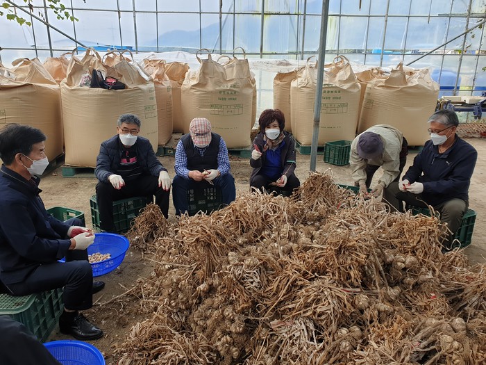이날 박형용 위원장과 이숙애, 이의영, 이상욱, 장선배 의원은 직원들과 함께 옥천군 한림 농장을 찾아 마늘 쪼개기 및 다듬기, 농업 부산물 정리 등의 작업을 도우며 부족한 농촌일손에 힘을 보탰다.