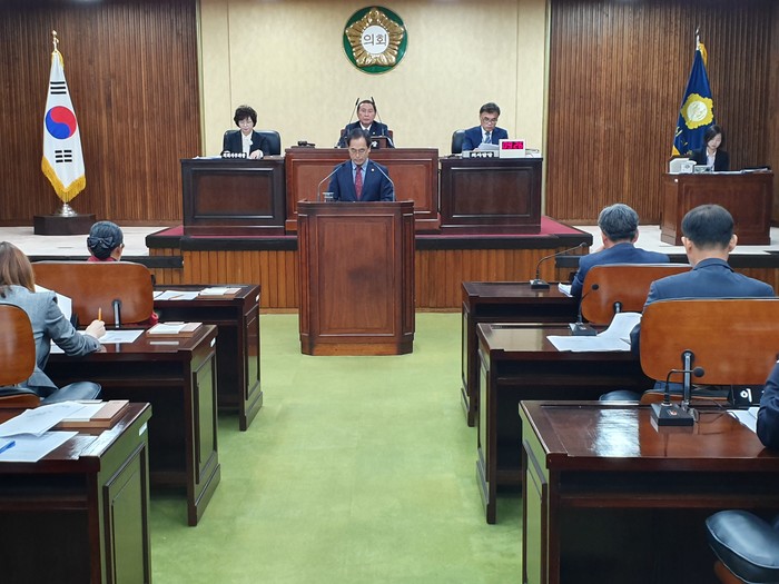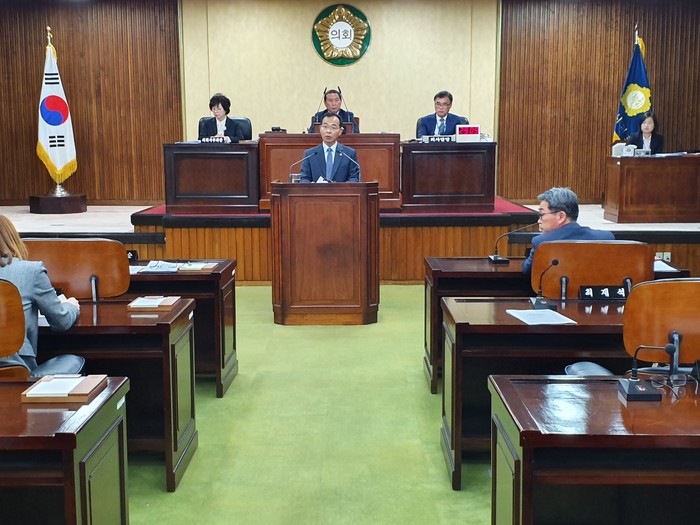 ▲ 임응택 의원은 시정질문에서 “오랜 진통 끝에 진행되는 해수관로 공사가 당초목적대로 사용되려면 위치선정 연구 등 적극적인 행정이 필요하다”고 발언하고 “허가기간이 만료된 전천강변의 쌍용양회 전용도로 재연장 문제에 대해서도 충분한 검토로 전천을 주민에게 돌려줄 방안을 고민해 봐야 한다”고 촉구했다.
