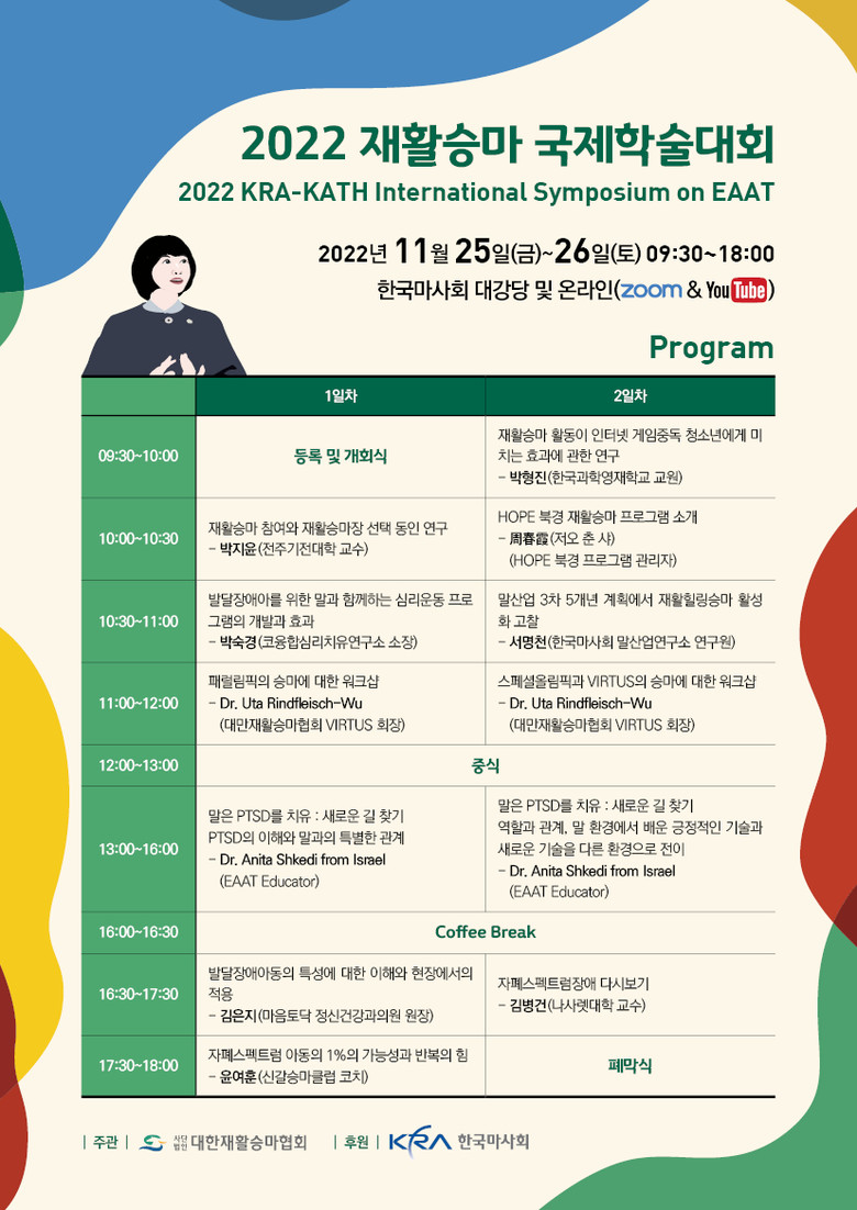 2일차에는 박형진 한국과학영재학교 교원이 발표하는 ’재활승마 활동이 인터넷 게임중독 청소년에게 미치는 효과에 관한 연구‘와 한국마사회 말산업연구소 서명천 연구원이 발제자로 나서는 ‘말산업 3차 5개년 계획에서 재활힐링승마 활성화 고찰’ 등 총 6개의 세션으로 채워진다. 최근 화제를 모으며 종영한 드라마 ‘이상한 변호사 우영우’의 자문을 맡았던 김병건 나사렛대 교수가 ‘자펙스펙트럼장애 다시보기’라는 주제로 국제학술대회의 마지막 연사로 나선다.