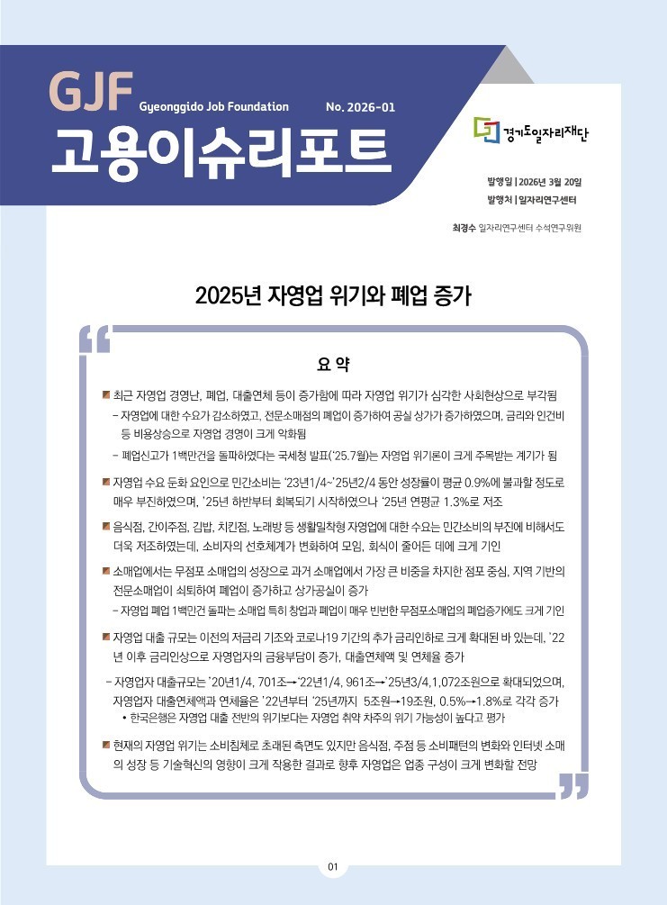 리포트 전문은 경기도일자리재단 누리집 ‘정책연구’ 메뉴 ‘이슈페이퍼’에서 확인할 수 있다. 자세한 사항은 일자리연구센터로 문의하면 된다.