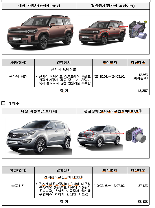 싼타페 HEV 18,397대는 전자식 브레이크 소프트웨어 오류로 원격제어장치 작동 중단 시 차량이 즉시 정지되지 않는 안전기준 부적합으로 6월 28일부터 시정조치에 들어간다.