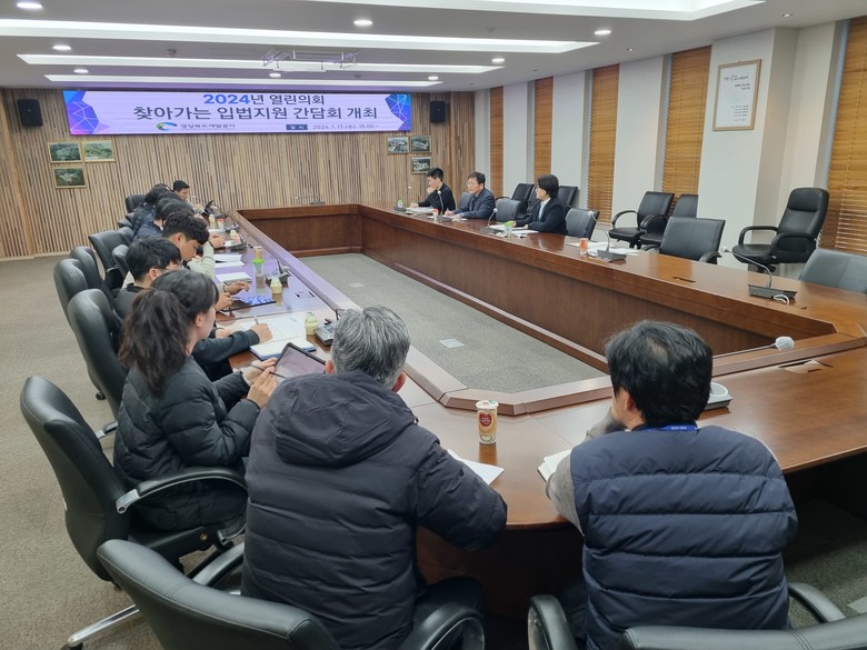 1월 17일 경상북도개발공사(예천)를 찾아 부서별 실무자들로부터 노동이사제 도입, 신재생에너지 사업, 직원 자기계발 학습지원, 공사채 발행 계획, ESG 경영, 임금피크제, 은퇴과학자 마을 조성사업 등 업무 전반에 대한 의견을 청취했다.
