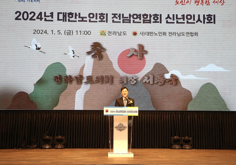 [전남 세계타임즈=우덕현 기자] 전라남도의회 서동욱 의장은 1월 5일 남악 스카이웨딩컨벤션에서 열린 2024년 대한노인회 전남연합회 신년인사회에 참석해 “어르신들의 오랜 경륜을 지역발전의 밑거름으로 삼고, 행복한 노후를 보내실 수 있도록 관심과 지원을 아끼지 않겠다”고 밝혔다.