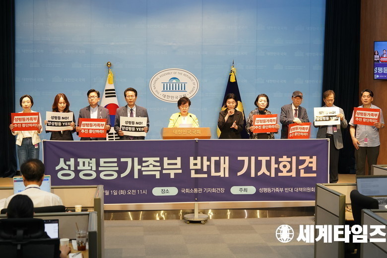 '조배숙 '국민의힘 의원과 성평등가족부 반대 대책위원회 관계자들이 1일 서울 여의도 국회 소통관 기자회견장에서 성평등가족부 반대 기자회견을 하고 있다.