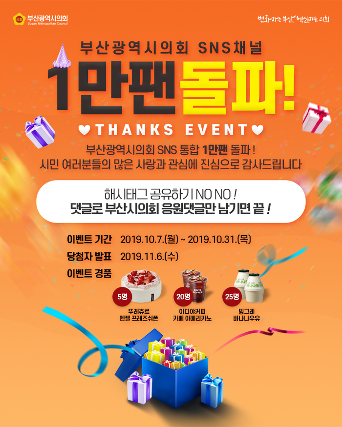 부산시의회는 1만명 구독 돌파를 기념하기 위해 시민 감사이벤트를 진행한다. 10월 7일부터 10월 31일까지 부산시의회 공식 SNS 각 매체별로 축하 댓글을 남기면 추첨을 통하여 생크림케이크(2만원 상당)등을 제공할 계획이다.