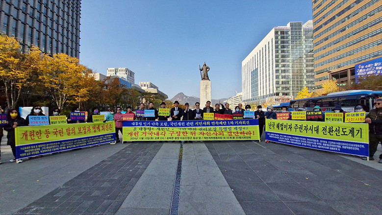 ‘개헌개혁행동마당’(상임의장 송운학) 외 32개 (총 33개) 시민단체는 “이번 주 화요일(11.12.) 낮 2시부터 약 1시간 동안 서울 종로구 광화문광장 이순신장군 동상 앞에서 대표와 회원 등 약 40명이 개최한 ‘대통령 임기단축 포함, 국민개헌 관련 시민사회 연속제안 1차 기자회견’에서 ‘윤 대통령은 <개헌안 등 국민발의 권리보장 특별법>(이하 특별법) 즉각 제정하고, 개헌거국내각 구성한 뒤 자진사퇴 결단하라!’고 제안했다”고 밝혔다.