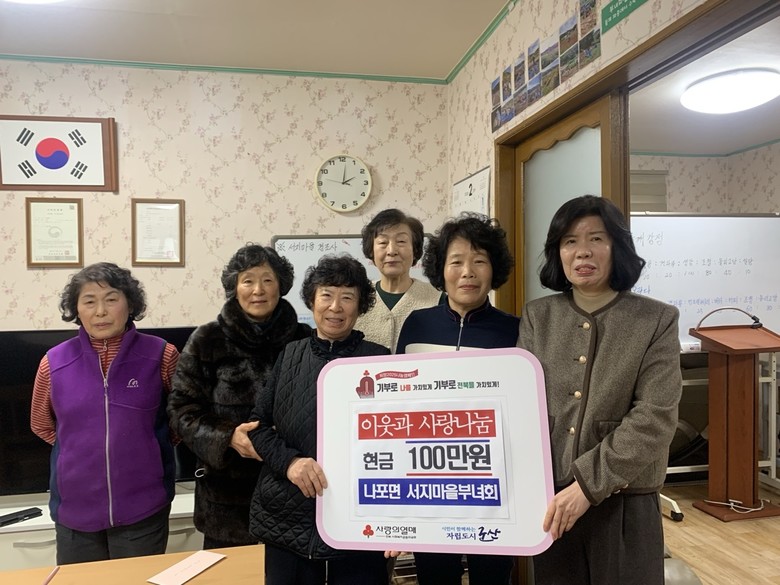 [군산시=세계타임즈 = 이영임 기자] 군산시 나포면(면장 김소영) 서지마을 부녀회(부녀회장 김정애)가 관내 어려운 이웃에게 사용해달라며 이웃돕기 성금 100만 원을 기탁했다. 특히 이번 성금은 지역공동체의 아름다운 협업으로 만들어진 소중한 결과물이어서 더욱 큰 의미로 다가오고 있다.