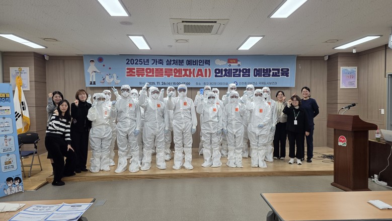 [중구 세계타임즈=심하린 기자] 인천 중구보건소(국제도시보건과)는 지난 26일 중구 제2청 대회의실에서 가축 살처분 예비 인력과 보건소 신속 대응요원을 대상으로 ‘조류인플루엔자(AI, Avian Influenza) 인체감염 예방 교육’을 실시했다.