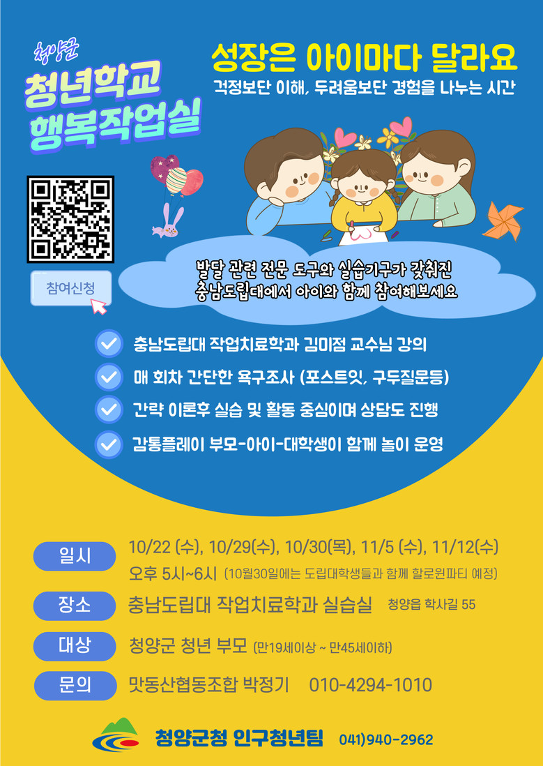 ‘행복작업실’은 앞으로 총 5회차에 걸쳐 청양군의 청년부모와 아동을 대상으로 운영되며, ‘교육–돌봄–정주’가 연결되는 청년 지역정착형 플랫폼의 성공 사례로 주목받고 있다.