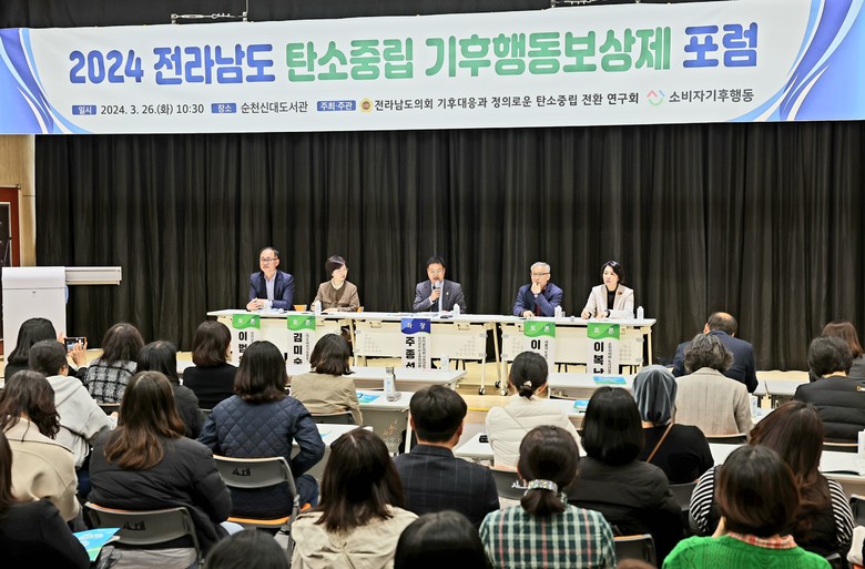 [전남 세계타임즈=우덕현 기자] 전라남도의회 기후대응과 정의로운 탄소중립 전환 연구회(대표위원 주종섭)가 주최하고 (사)소비자기후행동(전국대표 김은정)이 주관한 ‘2024 전라남도 기후행동보상제 포럼’이 지난 3월 26일 순천에서 당초 예상보다 많은 130여 명이 참석한 가운데 성황리에 마쳤다.