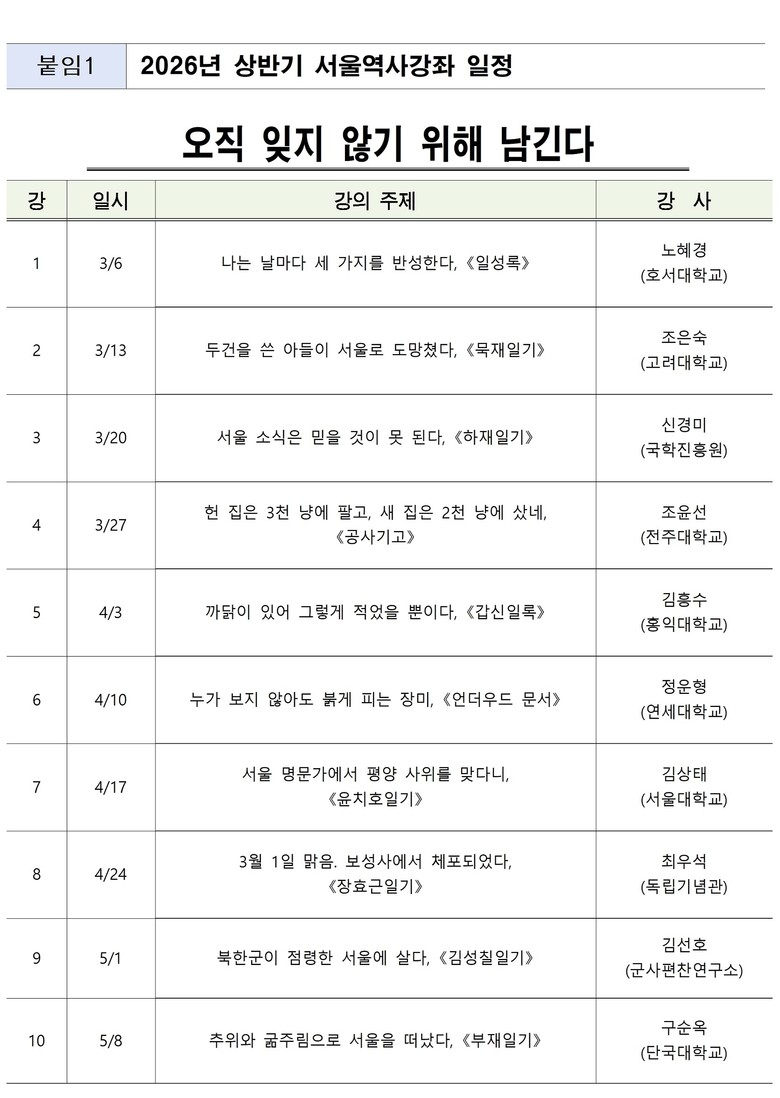 - 2월 2일(월)~13일(금) 수강생 모집, 총 100명…3월 6일부터 매주 금, 10회 강의 [서울 세계타임즈=이장성 기자] 서울역사편찬원(원장 이상배)은 2026년 상반기 서울역사강좌를 ‘오직 잊지 않기 위해 남긴다’를 주제로 운영한다. 조선시대부터 현대까지 개인이 남긴 일기와 여러 기록물을 통해 서울의 역사를 조명한다.