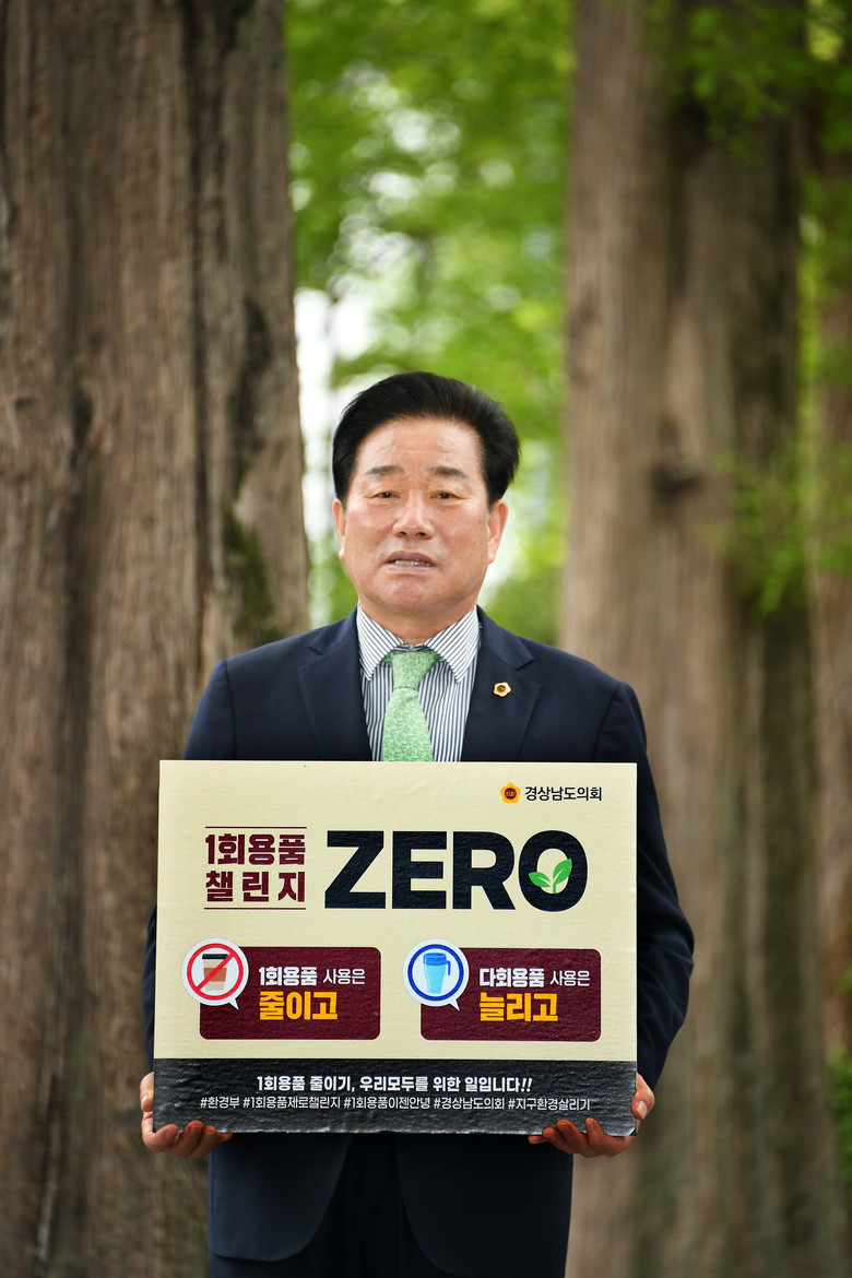 [경남 세계타임즈=최성룡 기자] 김진부 경상남도의회 의장은 18일 일상생활 속 일회용품 사용 줄이기 실천을 약속하는 환경부 주관 ‘1회용품 제로 챌린지’에 동참했다. 이번 챌린지 참가는 김윤철 합천군수 지목에 따라 이루어졌다.