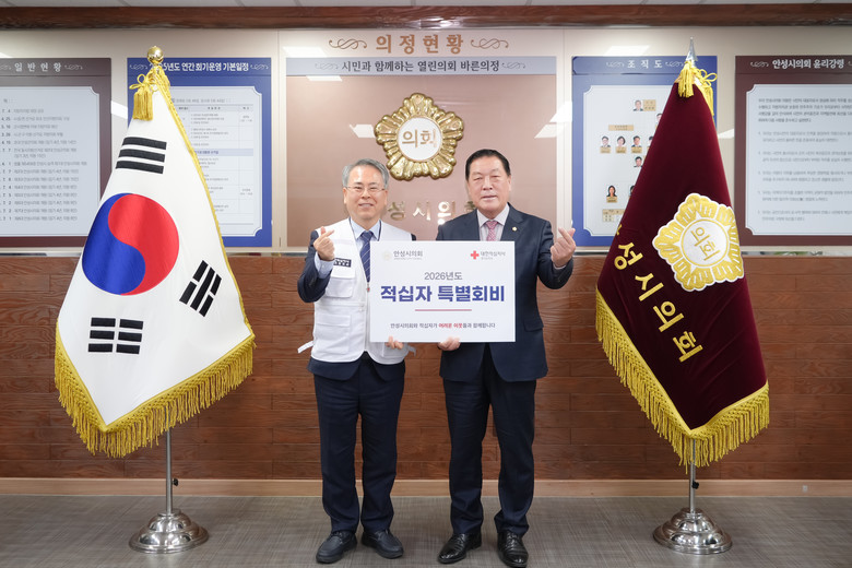 [안성시 세계타임즈=송민수 기자] 안성시의회(의장 안정열)는 19일 대한적십자 경기도지사에 2026년 적십자 특별회비를 전달하며 긴급구호 및 따뜻한 이웃나눔 활동에 동참을 하였다.
