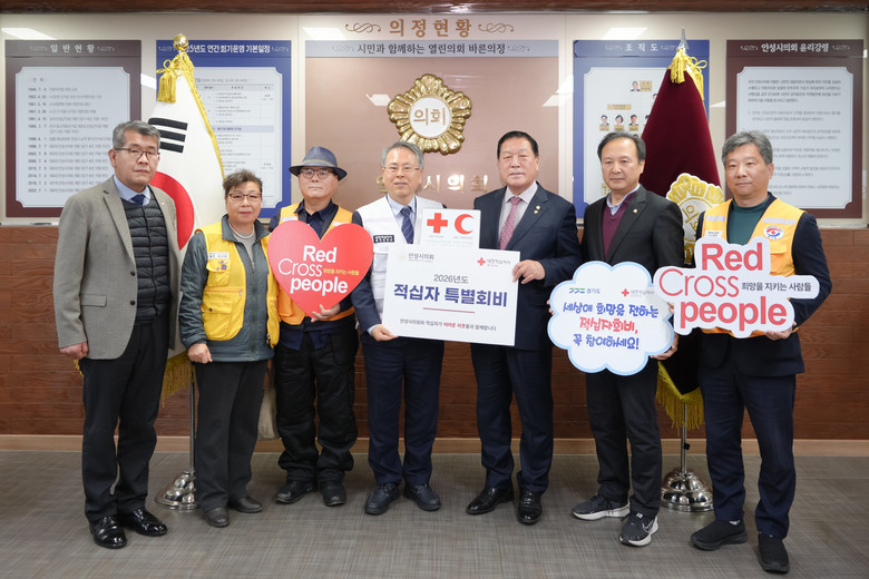 전달식에서 안정열 의장은 “적십자 특별회비가 재난발생 및 복지사각 지대 취약 계층 등에 구호활동 전개, 위기 속에 놓인 이웃들에게는 따뜻한 손길이 되고, 다시 삶을 이어갈 수 있는 작은 빛이 되기를 바란다”며, “안성시의회는 시민의 삶 가까이에서 어려움을 살피는 의정을 통해, 도움이 필요한 이웃들을 위한 지역 복지 울타리를 더욱 단단히 만들어 가겠다”고 말했다.