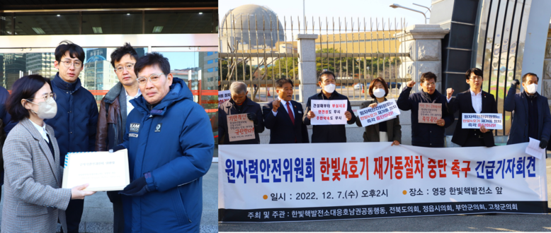 특히 고창군의회 조규철 의원은 기자회견에서 “한빛원전 4호기는 140개의 공극 발생과 철판 부식 등의 심각한 결함이 발견되어 5년 이상 가동이 중단된 세계적으로도 유례를 찾기 힘든 부실투성이 발전소”라고 외치면서 “철저한 안전성 검증이 담보되지 않고 지역 주민의 불안감이 최고조인 지금의 상태에서 진행되는 한빛원전 4호기 재가동 절차를 즉각 중단할 것을 강력하게 촉구한다”고 목소리를 높였다.