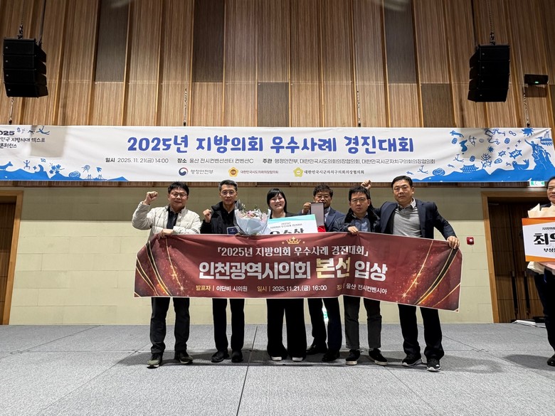 [인천 세계타임즈=심하린 기자] 인천광역시의회(의장 정해권)가 최근 울산시 전시컨벤션센터에서 열린 행정안전부 주관 ‘2025년 지방의회 우수사례 경진대회’에서 우수상을 수상했다고 24일 밝혔다.
