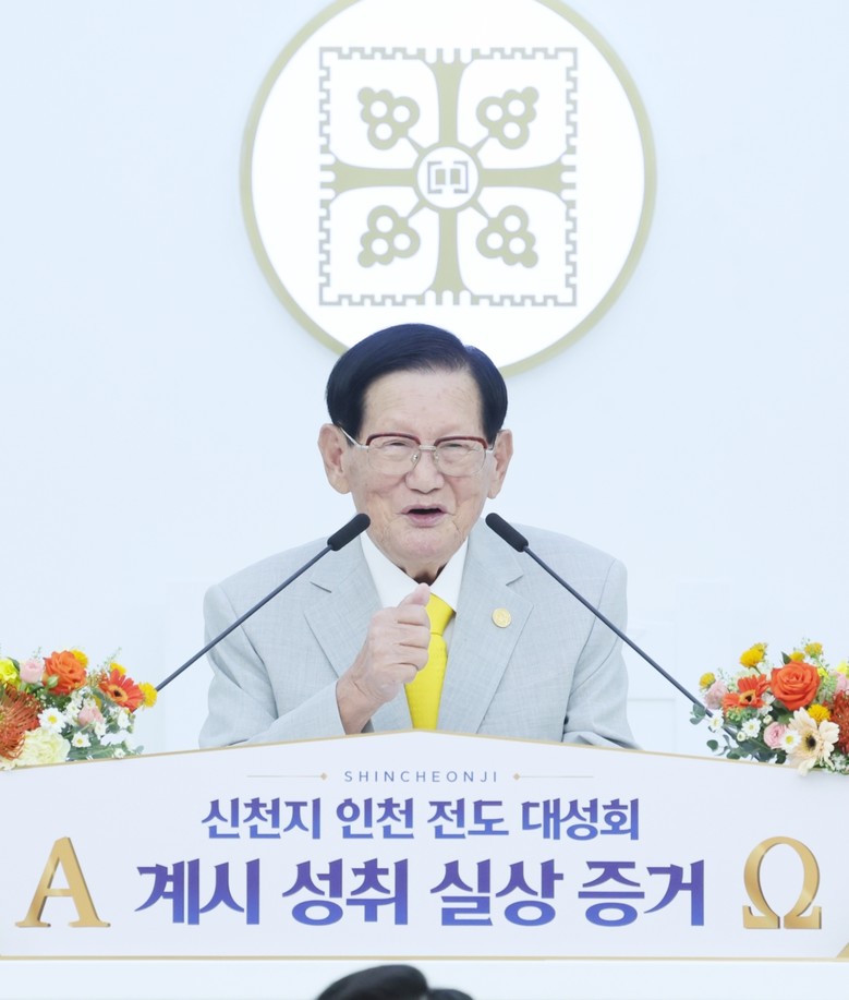 6일 열린 ‘신천지 인천 전도 대성회’에서 힘주어 강연하는 이만희 총회장