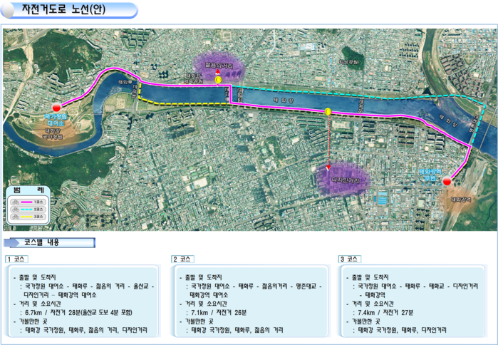 이에, 울산시 건설도로과 관계자는 현장을 둘러보고 직접 자전거를 이용하여 체험해 보며, 이용자 편의와 울산의 관광명소 홍보라는 두 마리 토끼를 한 번에 얻을 수 있는 공공자전거 코스안(1~3노선)을 마련했다.
