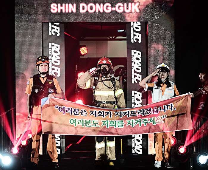 방화복 복장에 산소통을 메고 등장한 신동국은 힘차게 포효하며 1라운드를 맞았다.