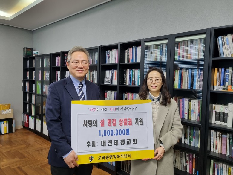 [중구 세계타임즈=이채봉 기자] 대전 중구 오류동(동장 조명화)은 5일 대전태평교회(담임목사 한상현)에서 다가오는 설 명절을 맞아 관내 저소득층에게 지원해달라며 상품권 100만 원을 후원했다고 밝혔다.