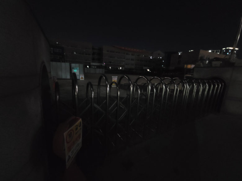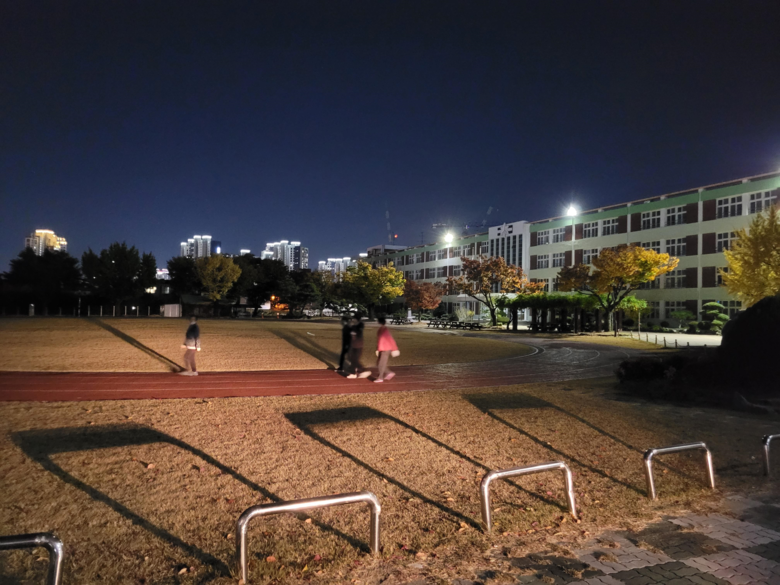 ▼조명이 설치된 밝은 학교운동장 | ▼조명이 없는 어두운 학교 운동장 |