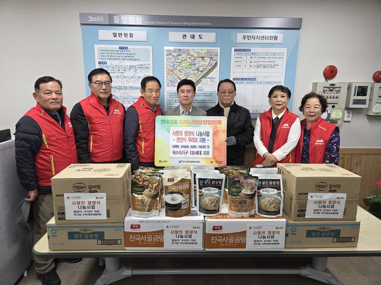[연수구 세계타임즈=심하린 기자] 연수구 연수3동 지역사회보장협의체(위원장 김재식·윤성연)는 지난 27일 저소득 가정에 영양식 꾸러미(갈비탕, 꼬리곰탕, 닭곰탕, 곰탕)를 전달하는 ‘사랑의 겨울 영양식 나눔 사업’을 실시했다.