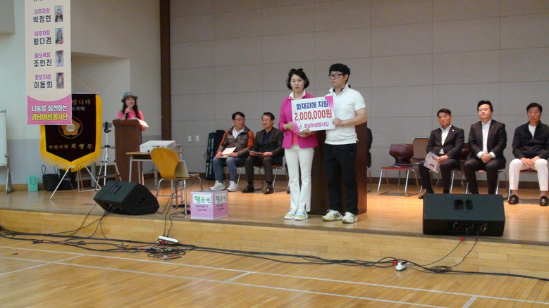 경남여성봉사단 제2회 사랑나눔 바자회 및 봄 운동회 개회식에서 이수진 회장은 산청지역 산불피해 관계자에게 산불기금 일금200만원을 직접 전달했다.